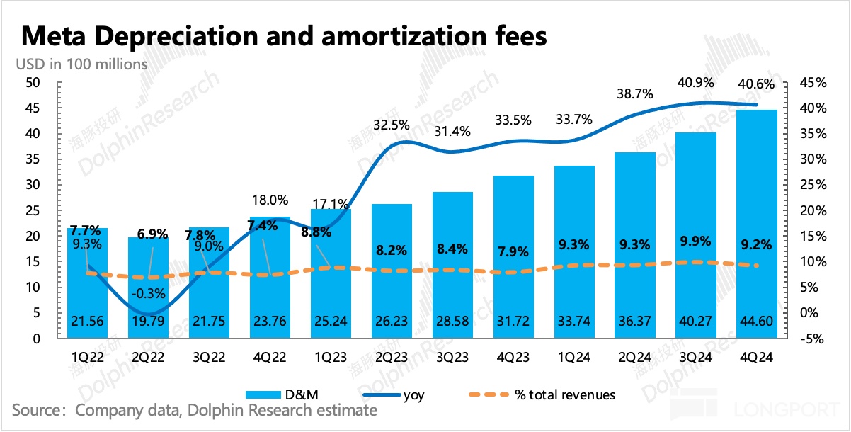 年初 Meta 宣布裁员 5%,2025 年也将对服务器折旧年限进行延长。但增幅 20% 以上的 Opex 指引表明,一年左右的中期视角,Meta 在边际上可能仍然避免不了收入放缓、支出增加下,盈利增长承压的趋势。尤其是上半年还会受到高美元汇率的对增长的拖累。