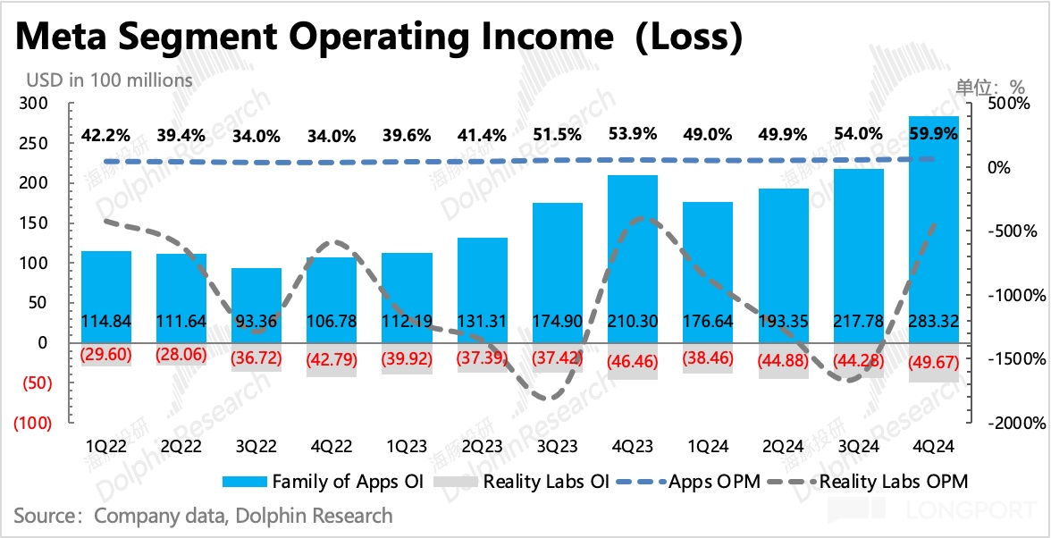 最终四季度 Meta 经营利润率 48%(剔法务费用营销为 45%),按照广告、VR 两大业务细分来看,利润率提升还是主要靠广告。一如公司管理的预期,VR 的亏损同比仍有所扩大,要显著减亏,还需要更多的大单品爆卖。