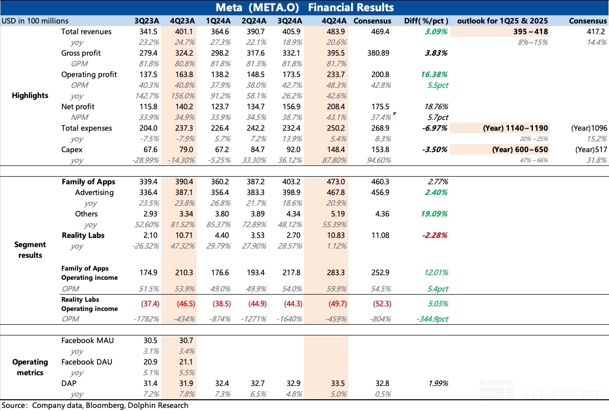 一方面,收入小超预期,主要是四季度渠道调研中,广告主对 Meta 投放一般,只能说基本 inline 的水平。而面对医疗广告的投放监管压力,四季度 Meta 也在平台内部进行了调整,因此医疗保健广告的规模相比去年要受到一些影响,并且会延续到 2025 年全年。