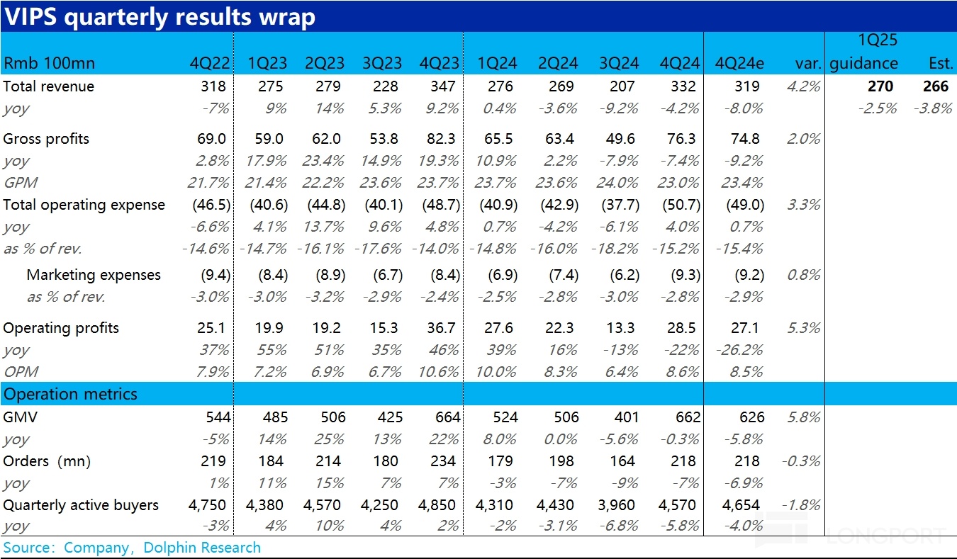 北京时间 11 月 19 日美股盘前,$唯品会(VIPS.US) 发榜了 2024 年 4 季度财报,概括来看由于大超预期的 GMV 指标,唯品会本季各主要财务指标普遍好于预期,且慷慨的股东回报都是亮点,具体来看: