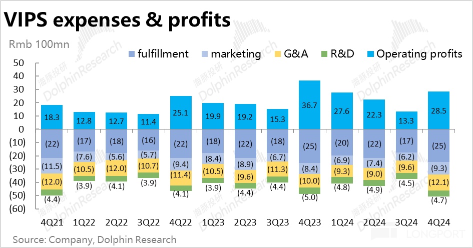 其他费用上,履约和研发支出同比负增 3%~5%,但管理支出同比大增 20%,可见是本季整体费用支出高于预期的原因。具体来看,年末唯品会在管理费用上确认的股权激励支出同比增多了约 2.4 亿。