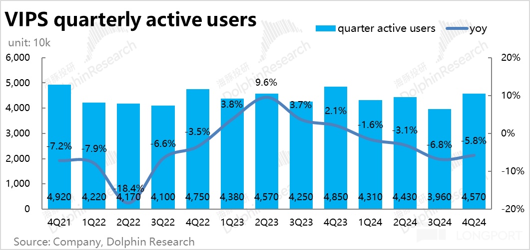 不过,本季活跃用户为 4570 万,同比减少了约 280 万人,下滑幅度和上季接近(290 万),比市场预期的 4654 万稍低。可见在目前激烈的竞争环境下,唯品会的用户流失仍在继续,对于部分价格或补贴敏感型的非忠诚用户,唯品会的吸引力不强。但稳住了核心的 SVIP 用户,以及核心的服饰穿戴品类,至少是稳住了基本盘。