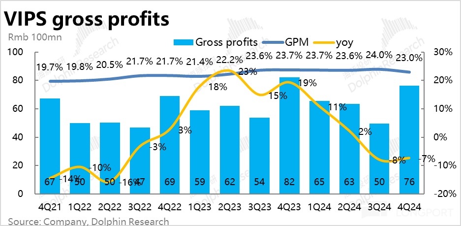 2、由于 GMV 超预期的表现,本季唯品会的总营收虽仍同比下降了 4.2%,但显著好于市场预期的-8%。分收入类型,商品销售收入同比负增 5%,明显好于上季-10% 的表现。广告、物流等附加服务收入同比增长了 4%,则较上季大体持平。