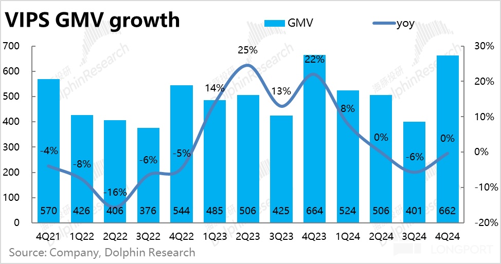 1、本季度唯品会 GMV 实现 662 亿,同比大体持平。虽然没有增长,但由于已有负增长的先例、本季更差的社零数据和管理层早先的保守指引,市场对本季 GMV 的预期是 4%~6% 的负增长。GMV实际同比持平已是重大 beat。
