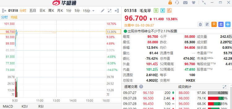 华盛资讯3月10日消息,港股盘初,毛戈平大涨逾12%,截至发稿,报96.7港元,成交额近2.3亿港元。
