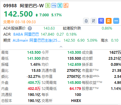 华盛资讯3月18日讯,港股阿里巴巴-W涨超5%,隔夜美股市场阿里巴巴收涨4.59%报147.57美元。
