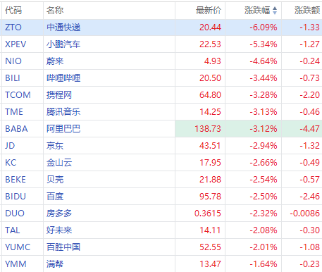 中通快递跌超6%,小鹏汽车跌超5%,蔚来跌超4%,哔哩哔哩、腾讯音乐、阿里巴巴跌超3%,京东、贝壳、百度跌超2%。