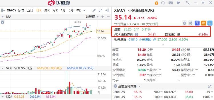 小米集团ADR $XIACY 盘前微涨0.31%,报价35.25美元,较今日港股收盘价折价约4%;此前有消息称,传小米拟折价4.2-7.4%启动高达410亿港元的巨额股票配售。
