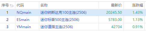 美股三大股指期货周一盘前集体大涨,标普500主连 $ESmain 涨1.13%,道指主连 $YMmain 涨0.91%,纳指主连 $NQmain 涨1.43%。