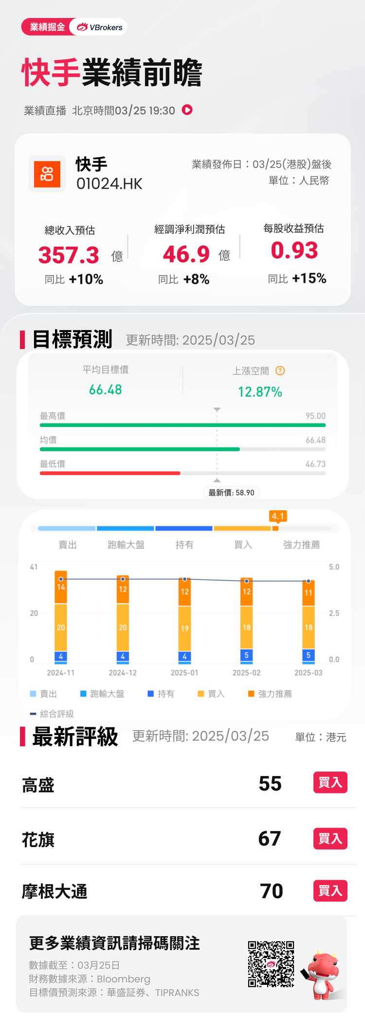 此外,快手整合DeepSeek模型于可灵大模型内,协助用户产生更多视像及图片,进一步降低内容产生门槛及AI GC输出质素。该行预测快手去年第四季销售按年升9%,受惠广告及毛交易总额按年升15%及14%;非公认会计准则(non-GAAP)净利润率料为13.1%,按季升0.4个百分点,non-GAAP净利润料47亿元。潜在股价催化剂包括今年首季及全年广告与毛交易总额展望、人工智能发展及今年的盈利率与盈利增长。该行予快手“买入”评级,目标价为55港元。
