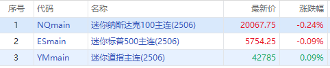 美股三大股指期货周四盘前涨跌不一,标普500主连 $ESmain 跌0.09%,道指主连 $YMmain 涨0.09%,纳指主连 $NQmain 跌0.24%.