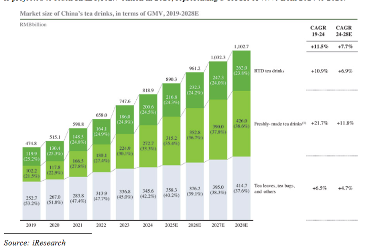 中国茶饮市场一直保持着增长态势。根据艾瑞咨询的数据,中国茶饮市场的商品交易总额(GMV)从 2019 年的 4748 亿元人民币增长到 2024 年的 8189 亿元人民币,预计到 2028 年将达到 11027 亿元人民币,2024 年至 2028 年的复合年增长率为 7.7%。