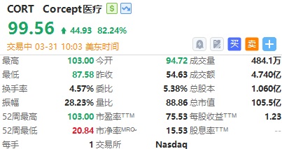Corcept医疗 $CORT 暴涨超82%,公司表示在三期卵巢癌药物研究中达到了主要终点。