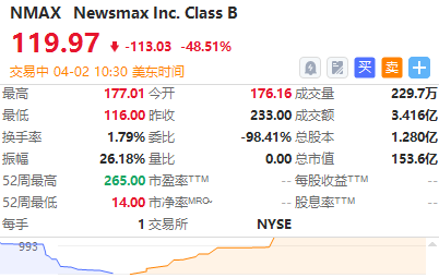 美国保守派媒体公司Newsmax $NMAX 暴跌48%,该股此前两日飙升22倍。这只股票一直受到散户投资者的欢迎。