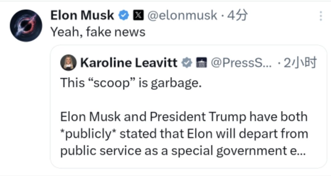 马斯克称有关他将辞去政府效率部职务的消息是“假新闻”。此前,美国白宫方面表示,马斯克在完成“政府效率部”的工作后将离开公职。稍早前,美国政治新闻网站(Politico)报道称,美国总统特朗普已告诉内阁成员和其他亲密联系人,马斯克将很快辞去政府职务。