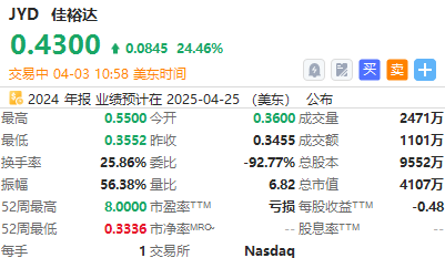 深圳佳裕达物流反弹涨超24%,该股昨日暴跌超95%。公司专注于提供跨境物流服务。佳裕达现已发展成为立足粤港澳大湾区、面向全国、布局全球的大型AAAA级综合服务型物流企业。