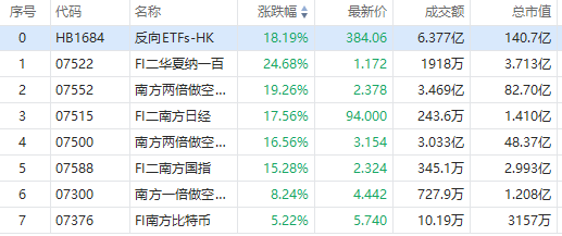 有些投资者可能会选择恒生指数反向ETF,以南方两倍看空恒指 $07500.HK 为例,这只ETF表现的是恒生指数相反方向的两倍,可以帮助投资者对冲短期市场波动风险,该ETF今日涨幅超16%。