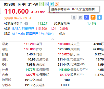如在华盛通APP可以看到,美团-W、阿里巴巴-W可以直接沽空(右侧带“沽”字),但沽空要付出一定的成本(融券利率)。