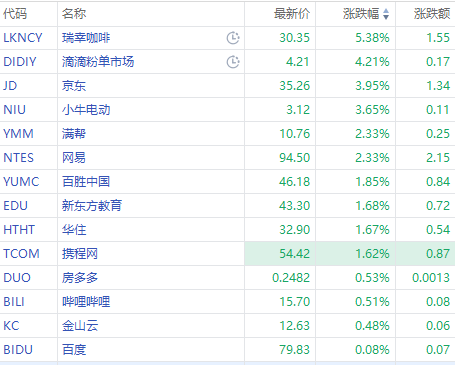 瑞幸咖啡涨超5%,滴滴涨超4%,京东、小牛电动涨超3%,网易涨超2%,百胜中国、携程网涨超1%,哔哩哔哩、百度跟涨。 $YINN 涨超9%。