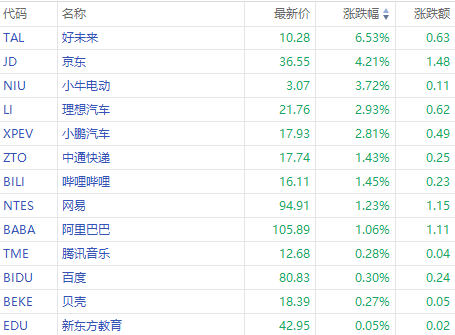 其中,好未来涨超6%,京东涨超4%,小牛电动涨超3%,理想汽车、小鹏汽车涨超2%,中通快递、哔哩哔哩、阿里涨超1%。