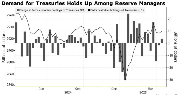 摩根大通资产管理公司表示,由于有迹象显示国外需求强劲,以及市场预期美联储将在必要时支持美国政府债务,美国国债目前可能已经触底。美联储最新数据显示,在截至4月9日的当周,代表海外央行、货币当局和国际组织持有的有价美国国债增加了36亿美元,此前两周呈下降趋势。