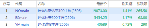 美股三大股指期货盘前小幅上涨,标普500主连 $ESmain 涨1.17%,道指主连 $YMmain 涨0.72%,纳指主连 $NQmain 涨1.41%。