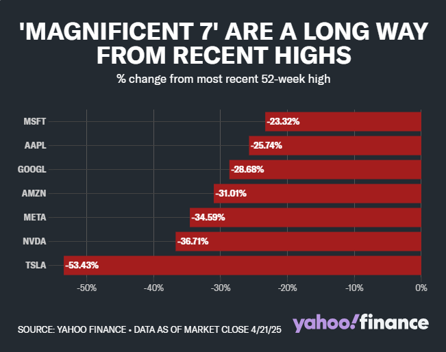 本周,超百家标普500指数成分股公司即将公布第一季度财报。在特朗普政府政策不断变动的背景下,投资者将密切关注各公司的业绩展望。其中,科技股成为焦点。在关税引发的市场下跌潮中,科技股领跌市场,“七巨头”股价,较近期52周高点均已下跌23%或更多。
