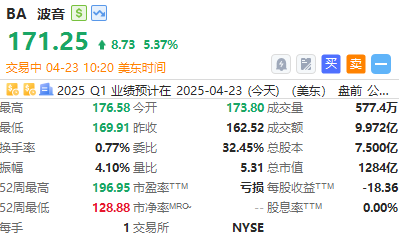 波音涨超5%,第一季度营收195亿美元同比增长18%,超出市场预期,同意以105.5亿美元出售部分数字航空业务。