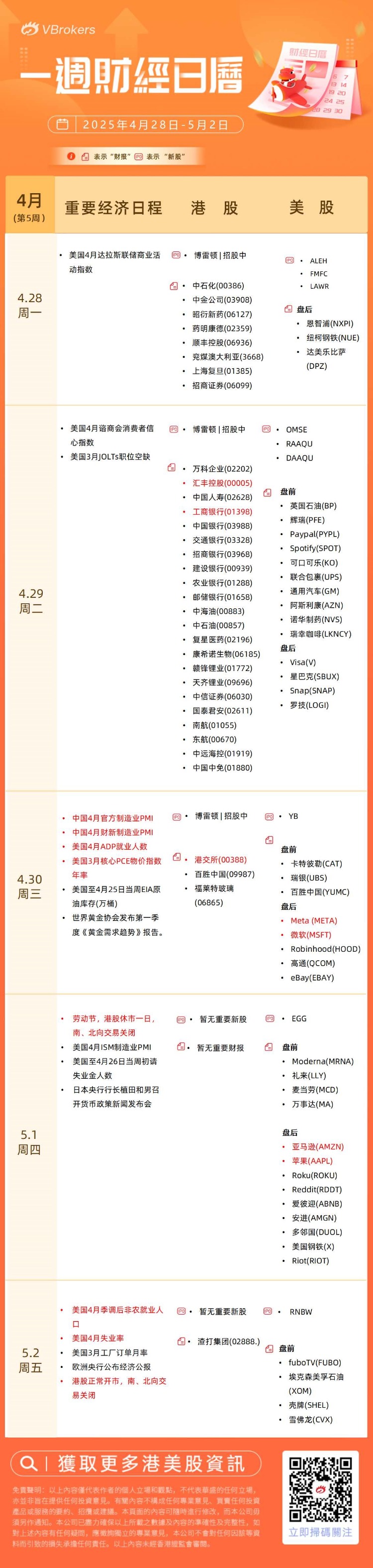 编者按:重磅数据周!“大小非农”、美国PCE数据来袭;巴菲特股东大会下周六召开;微软、苹果、亚马逊等将公布财报;下周四港股休市一日>>