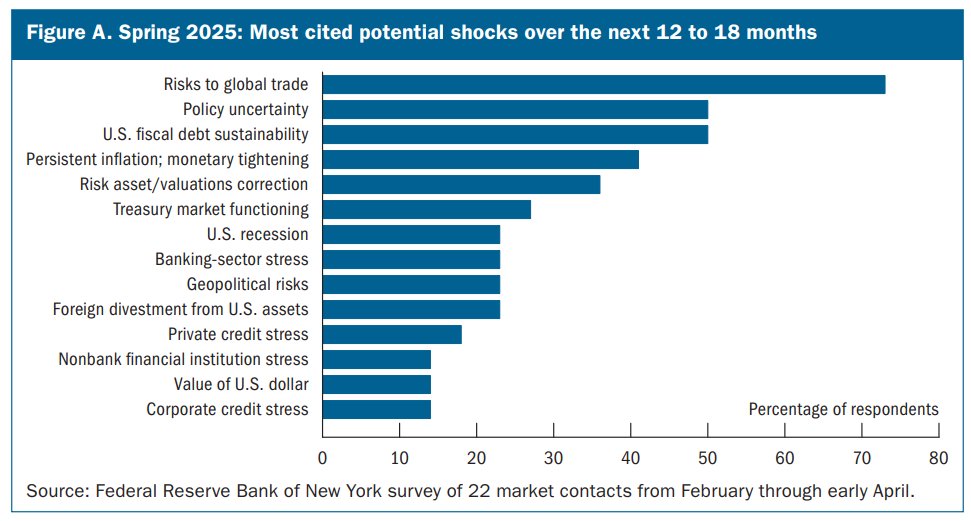 在报告的《金融稳定突出风险调查》一节中,高达73%的受访者将“全球贸易风险”列为首要担忧,这一比例达到去年11月报告的两倍多,同时也有半数受访者对“政策不确定性”表达担忧。在去年报告中位列榜首的“美国政府债务可持续性”只能屈居第三。