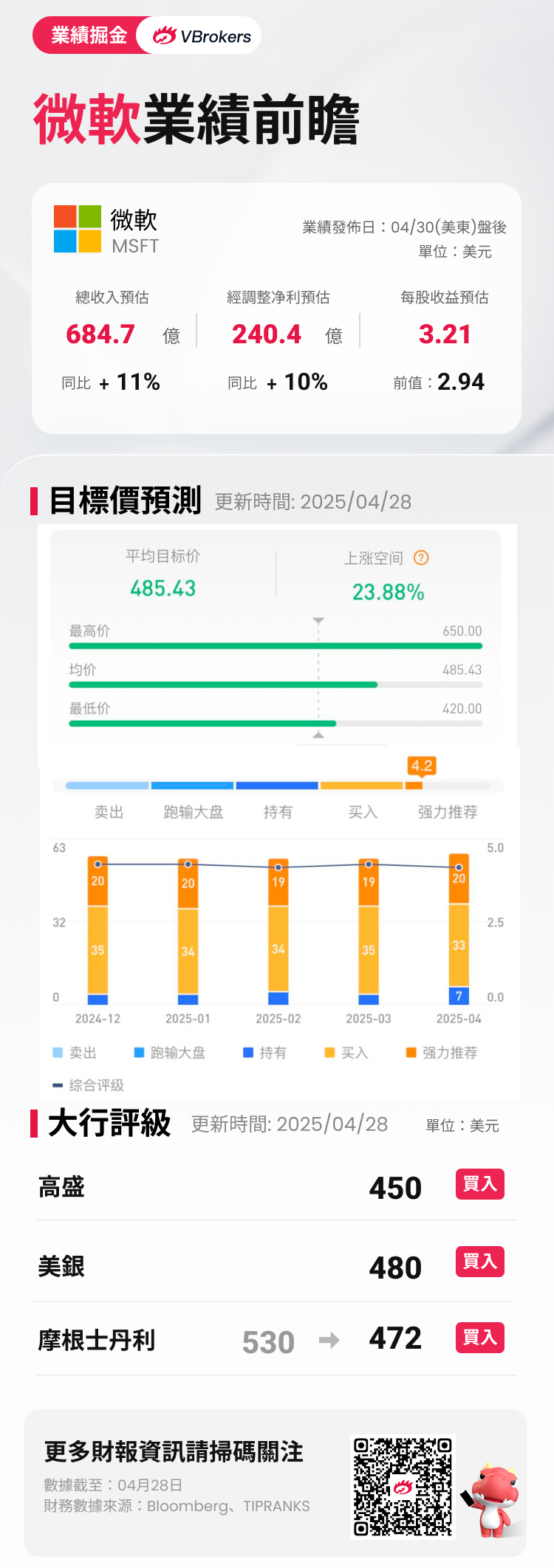 据彭博分析师预期,微软Q3财季营收为684.7亿美元,同比增长11%;调整后净利润240.4亿美元,同比上升10%;每股收益为3.21美元。近期共有33位分析师给出“买入”评级,平均目标价485.43美元。