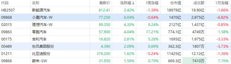 华盛资讯5月2日讯,新能源汽车股走强,小鹏汽车-W涨超6%,理想汽车-W、零跑汽车、小米集团-W涨超4%,吉利汽车涨超2%,比亚迪股份、蔚来-SW涨超1%。