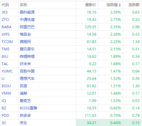 其中,晶科能源涨超3%,阿里巴巴、携程网涨超2%,哔哩哔哩、理想汽车涨超1%,拼多多、京东跟涨。