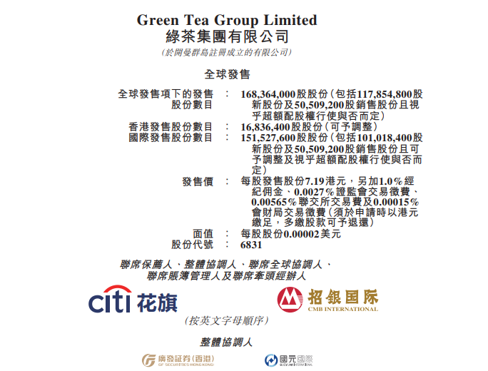 华盛资讯5月8日消息,绿茶集团 $06831.HK 启动招股,一手入场费2905港元。