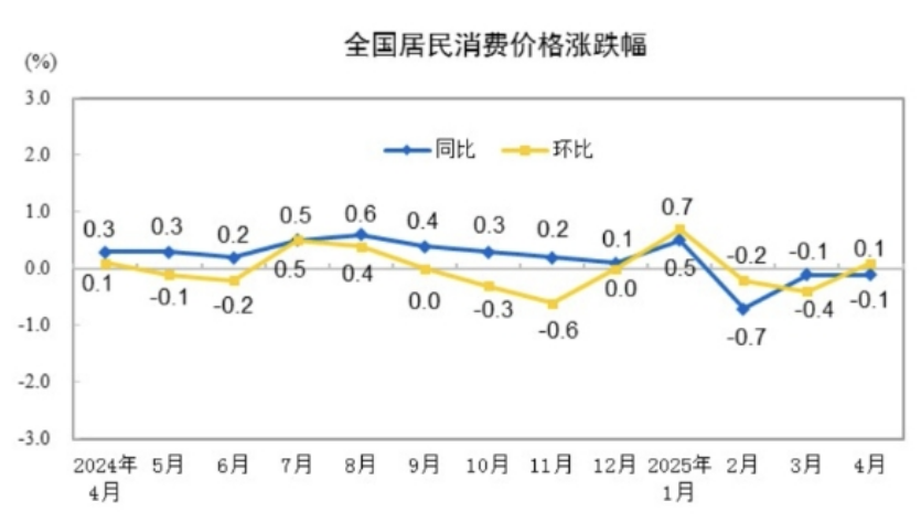 中国4月CPI同比下降0.1% 环比转为上涨