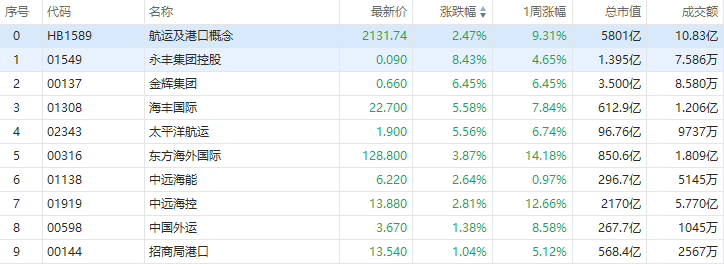 华盛资讯5月14日讯,港股航运及海运股集体走强,太平洋航运、海丰国际涨超5%,东方海外国际涨3.87%,中远海控、中远海能涨超2%,招商局港口跟涨。
