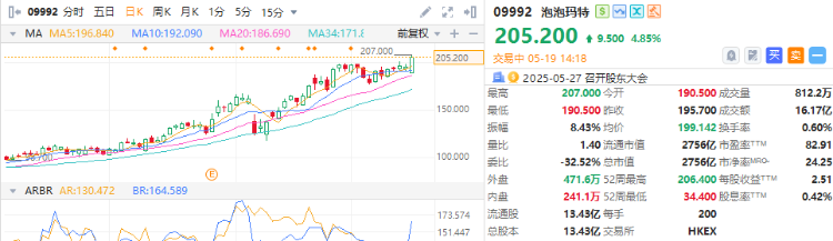 华盛资讯5月19日消息,泡泡玛特(09992.HK)一度涨超5%,高见207港元创上市新高。截至发稿,涨4.85%,报205港元,成交额16.17亿港元。