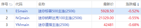 美股周三盘前,三大指数期货小幅下挫,纳指期货 $NQmain 跌0.55%,标普期货 $ESmain 跌0.55%,道指期货 $YMmain 跌0.68%