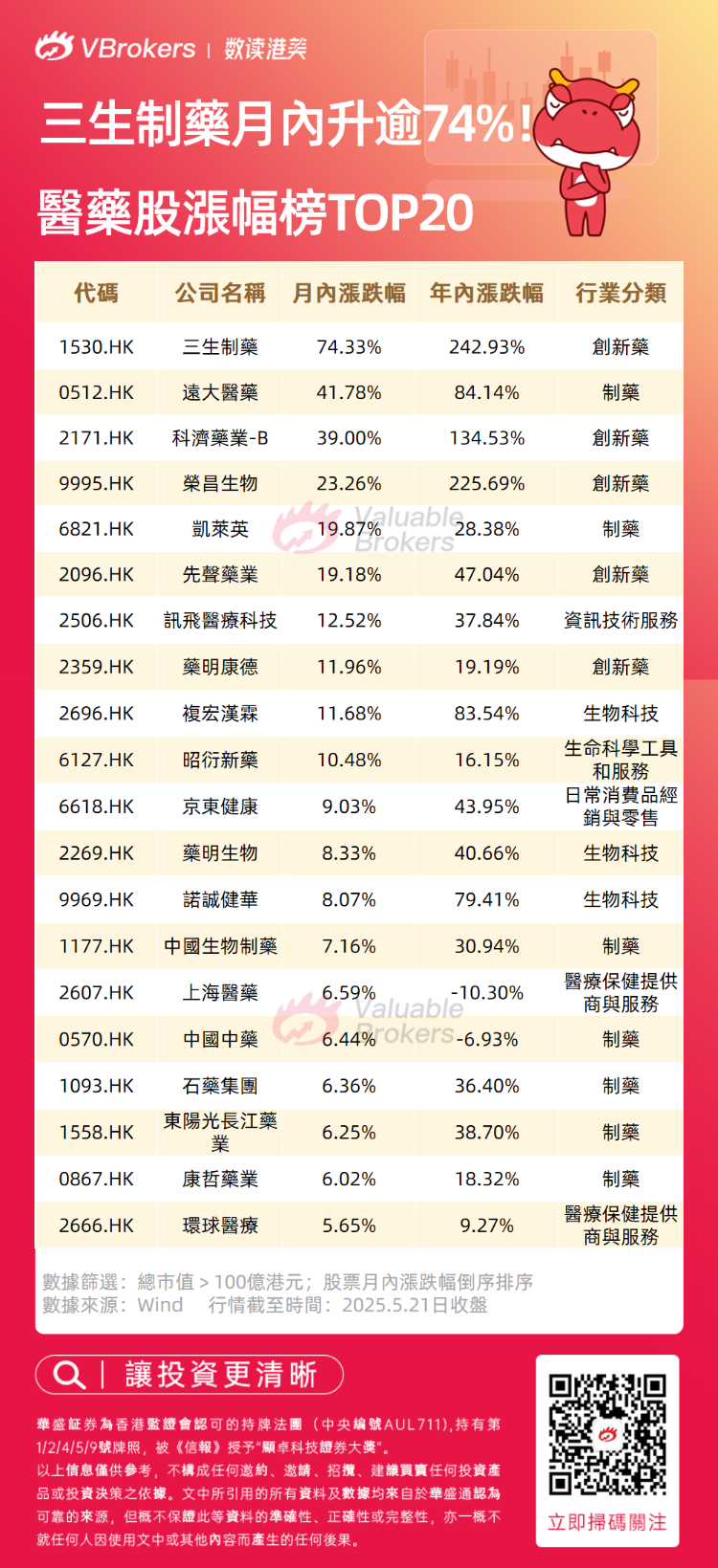 从近一月医药股表现数据来看,表现最为亮眼的当属三生制药,截至5月21日收盘,公司月内涨幅超74%,稳居涨幅榜TOP1。