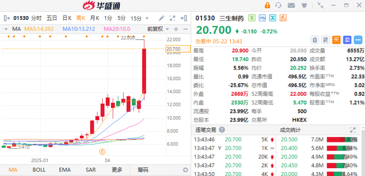 华盛资讯5月22日讯,港股医药股近期持续强势,今日早盘短暂回调后,午后板块再度翻红,截至发稿,四环医药、欧康维视生物-B涨超13%,开拓药业-B、映恩生物-B、金斯瑞生物科技涨超7%。值得关注的是,医药股“黑马”三生制药周内累计涨幅超60%。