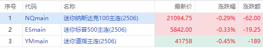 三大指数期货小幅下挫,纳指期货 $NQmain 跌0.29%,标普期货 $ESmain 跌0.33%,道指期货 $YMmain 跌0.45%