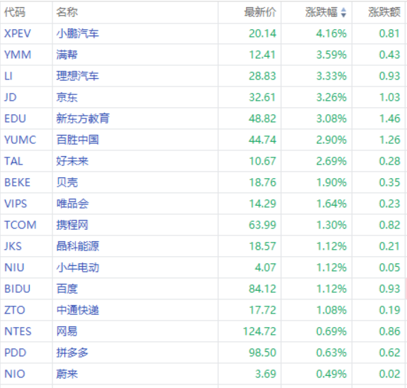 热门中概股走高,小鹏汽车涨超4%,京东涨超3%,小牛电动、百度涨超1%。