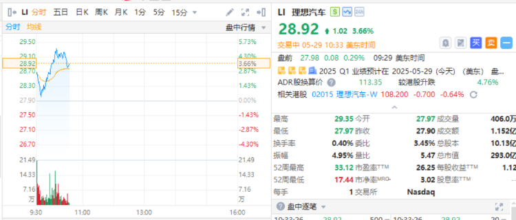 华盛资讯5月29日消息,理想汽车涨近4%,首季营收超预期+首款纯电SUV将于7月发布。