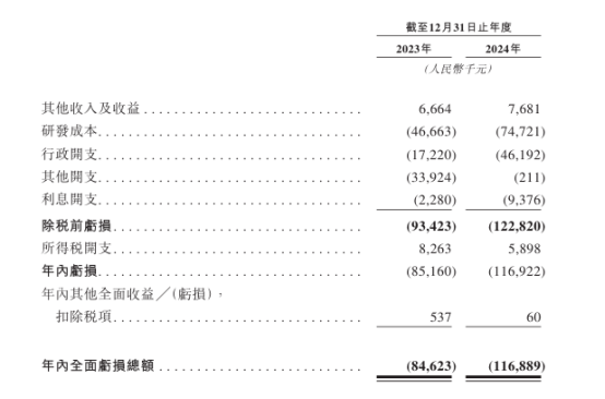 2023-2024年,公司分别录得其他收入及收益人民币666.4万元、768.1万元,年内亏损分别为人民币8516万元、1.17亿元。