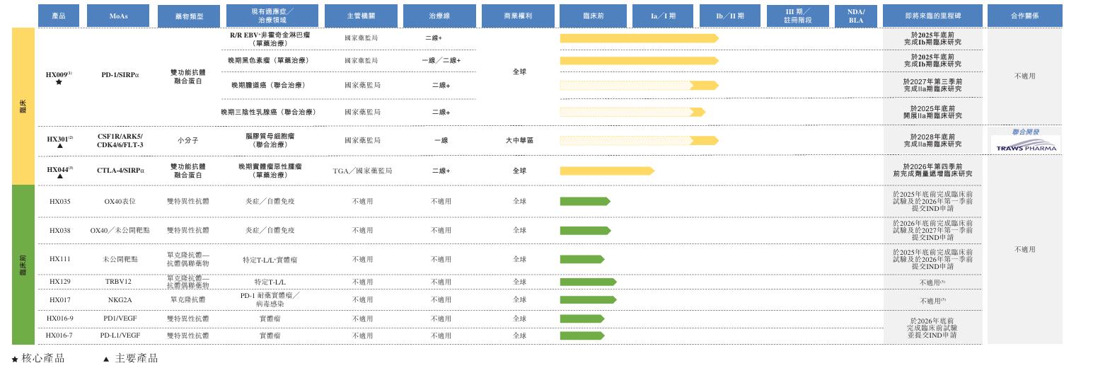 公司的核心产品HX009是一种自主研发的PD-1(一种免疫检查点受体)/SIRPα双功能抗体融合蛋白。于往绩记录期间及直至最后实际可行日期,公司已在澳大利亚及中国完成HX009的I期临床试验。公司目前正在中国进行三个HX009临床项目,即(i)治疗晚期黑色素瘤的HX009-I-01中国研究(Ib期 ); (ii)治疗复发性╱难治性Epstein-Barr病毒阳性非霍奇金淋巴瘤的HX009-II-02中国研究(I/II期); 及(iii)治疗晚期胆道癌的HX009-II-05中国研究(IIa期)。公司亦于2025年2月获得国家药监局对HX009与曲妥珠单抗联合治疗晚期三阴性乳腺癌患者的联合研究的批准,且公司预计该联合研究的首名患者招募将于2025年底完成。