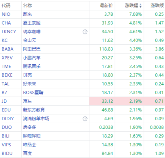 其中,蔚来涨超7%,霸王茶姬、金山云涨超4%,阿里巴巴、小鹏汽车涨超3%,京东涨超2%。