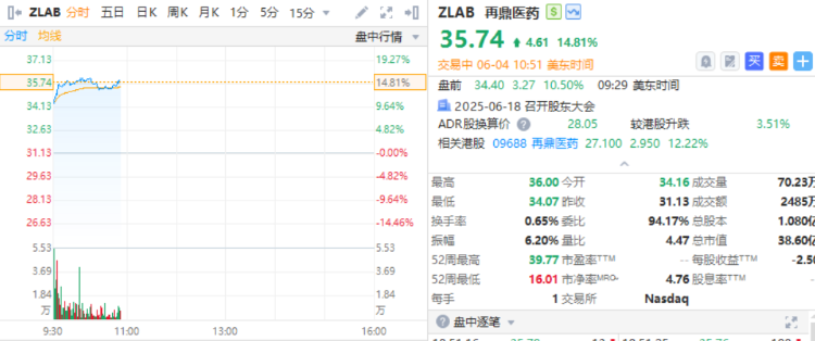 再鼎医药涨超14%,ZL-1310最新数据公布,展现强大的抗肿瘤活性及安全性。
