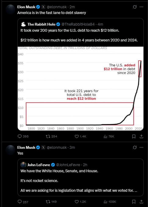 马斯克加大了对美国总统特朗普标志性减税法案的攻势,呼吁美国民众联系立法者,否决该法案。“给你的参议员打电话,给你的众议员打电话。让美国破产是不对的!”他建议,应该起草一项新的支出法案,避免赤字大幅增加,也避免将债务上限提高5万亿美元。他还转发别人的帖子并评论称,美国正快速堕为债务奴役。而就在同日,特朗普敦促国会山取消债务上限制度。