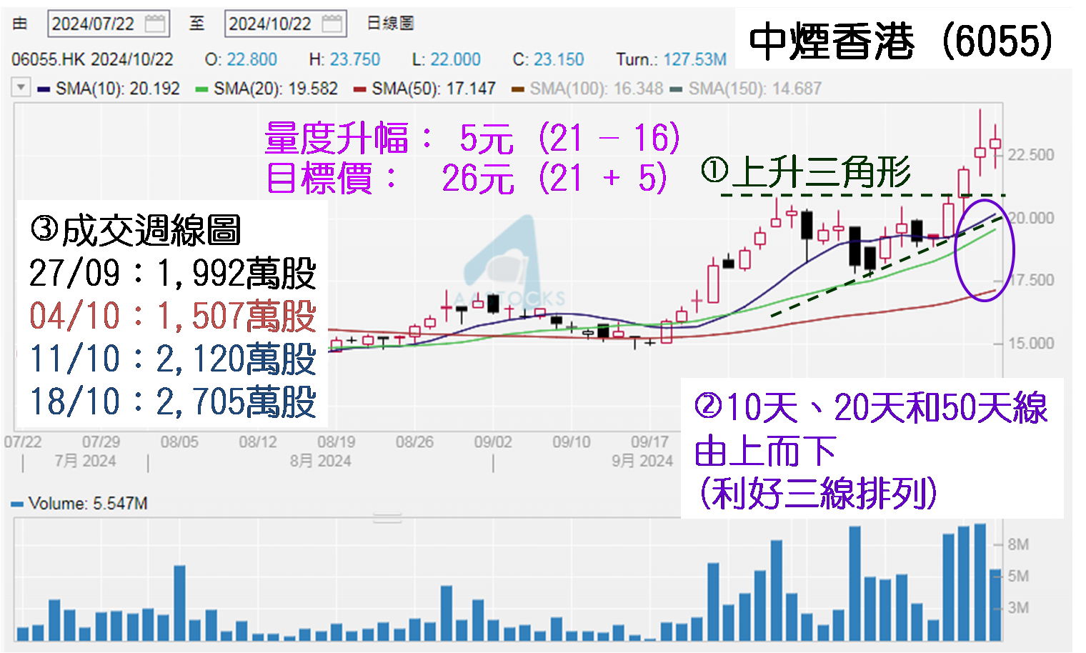 自2024年9月26日10天线上破20天线后,10天、20天和50天出现从上至下的“利好三线排列”走势,配合上述“上升三角形”出现后,顶线于21.00元阻力亦见上破,于是可看第三个特点,成交量在周线图要渐见上移,并处三个月高水平。于节目上图解时列出9月23日至10月17日四周的成交量,分别约1,992万、1,507万、2,120万和2,705万股,后两者连续两周见增量,代表三大特点都乎合,中烟香港当时已属于“动能强劲股”,股价后续走势可看好。当日节目在上午11:00结束,当时股价为23.55元,最终收报23.95元,当日已见微利。