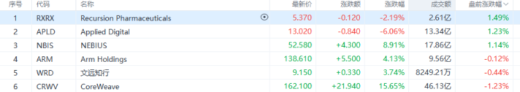 英伟达持仓股涨跌不一,Applied Digital、NEBIUS涨超1%,CoreWeave跌超1%。